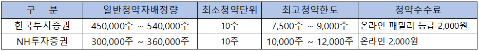 - 청약 가능 증권사 : 한국투자증권, NH투자증권