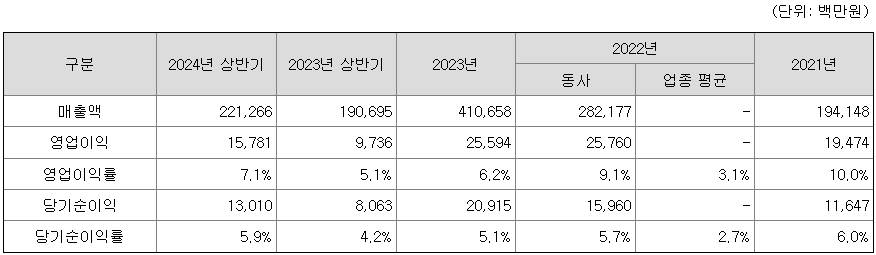 한편, 영업이익률은 2021년 10.0%에서 2022년 9.1%, 2023년 6.2%로 하락한 바 있으나, 이는 여전히 업종 평균인 3.1%를 상회하는 수준입니다. 이러한 영업이익률 하락은 코로나19 이후 전방위적인 물가 상승으로 수도광열비, 교통비, 운반비, 기타 용역업체에 대한 지급수수료 등이 큰 폭으로 증가한 데 기인하며, 동사는 가맹점과의 상생 및 공동 성장을 목표로 함에 따라 이러한 원가 상승분을 가맹점에 최소한으로 전가하는 전략을 채택하고 있다고 설명하고 있습니다.