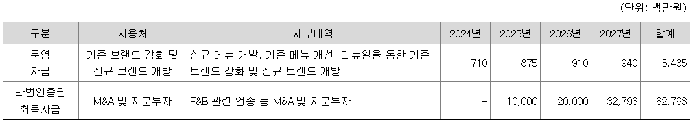 더본코리아는 금번 공모를 통해 조달된 자금으로 식음업체 인수 및 지분 투자 자금으로 628억을사용하고, 나머지 34억을 브랜드 개발 등 운영자금으로 사용할 계획입니다.