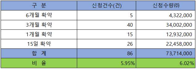 의무 보유 확약 건수는 86건에 73,714,000주로 전체 신청 물량 대비 건수로는5.95%, 수량으로는 6.02%였으며, 3개월 확약 비율이 40건에 34백만주로 비중이 제일 높았습니다.