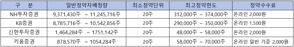 - 청약 가능 증권사 : NH투자증권, KB증권, 신한투자증권, 키움증권