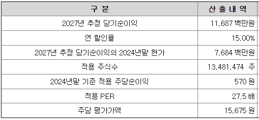 회사의 주당 평가가액은 2027년 추정 순이익을 할인하여 현재가치로 환산한 후, 주식 수로 나누어 주당순이익을 구하고, 여기에 유사회사의 평균 PER 배수를 곱하여 산출한 것입니다.