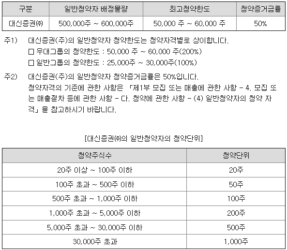대신증권의 일반 청약자 배정 물량은 500,000주 ~ 600,000주이고, 일반 청약자의 최고 청약 한도는 일반 그룹 기준 25,000주 ~ 30,000주입니다.