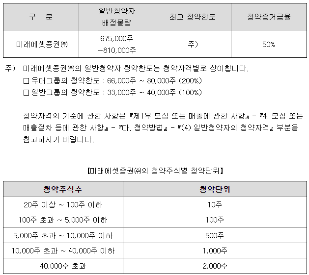 미래에셋증권의 일반 청약자 배정 물량은 675,000주 ~ 810,000주이고, 일반 청약자의 최고 청약 한도는 일반 그룹 기준 33,000  주  ~  40,000주입니다.
