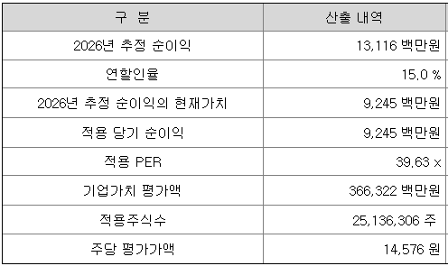 회사의 주당 평가가액은 2026년 추정 순이익을 할인하여 현재가치로 환산한 후, 유사회사의 평균 PER 배수를 곱하여 회사 가치를 정하고, 이를 주식 수로 나누어 신출한 것입니다.