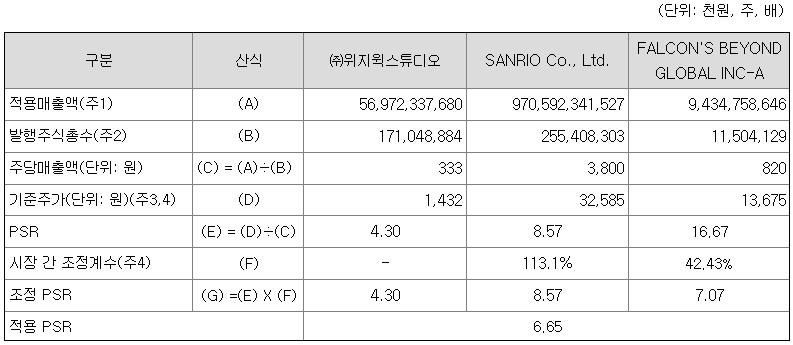그래서인지 유사회사의 PER배수(주가 대 주당 순이익 배수) 대신 PSR 배수(주가대 주당 매출액 배수)를 사용하여 희망 공모가 산정에 사용하고 있습니다.