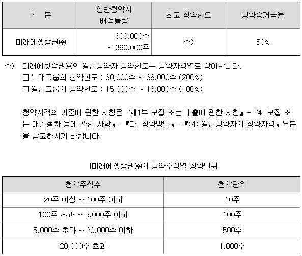 미래에셋증권의 일반 청약자 배정 물량은 300,000주 ~ 360,000주이고, 일반 청약자의 최고 청약 한도는 일반그룹 기준 15,000  주  ~ 18,000주입니다.