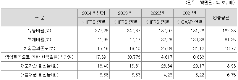 동사의 부채비율은 매년 개선되는 모습을 보이고 있으며, 2023년과 2024년 반기 기준 업종 평균 대비 낮은 모습을 보이고 있습니다. 2021년과 2022년은 신 공장 설립 및 설비증대를 목적으로 자금을 차입함에 따라 부채비율이 높게 나타났으나, 이후 우수한 영업활동으로 인한 현금흐름과 유상증자를 통한 자금의 유입 등으로 부채비율이 개선된 모습을 보이고 있습니다.
