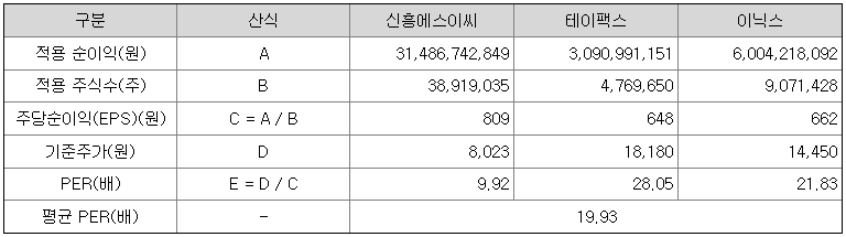 회사의 주당 평가가액은 2024년 반기말 기준 직전 12개월의 순이익을 주식 수로 나누어 주당 순이익을 구하고, 여기에 유사회사의 평균 PER 배수를 곱하여 산출한 것입니다.