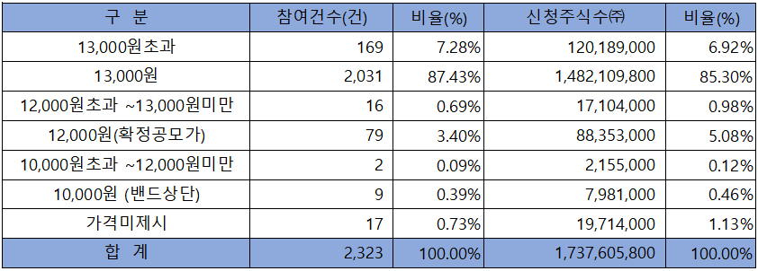 희망가격 상단 이상 신청 비율은 98.87%였으며, 확정 고모가 12,000원 이상 신청 비율도 98.28%에 달했습니다.