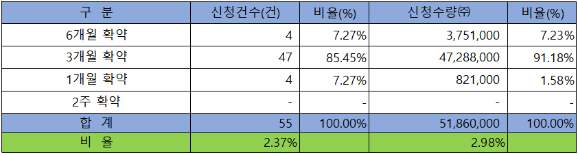 의무 보유 확약 건수는 55건에 51,860,000주로 전체 신청 물량 대비 건수로는 2.37%, 수량으로는 2.98%였으며, 3개월 확약 비중이 제일 높았습니다.