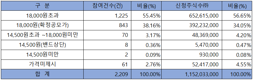 희망 공모가격 상단 이상 신청 비율은 95.37%였으며, 확정 공모가 18,000원 이상 신청 비율도 90.70%에 달했습니다.