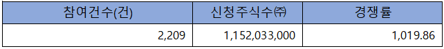 수요예측 참여 건수는 총 2,209건에 신청 주식수 1,152,033,000주로, 참여 경쟁률 1,019.86 : 1의 실적을 기록했습니다.