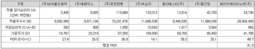 회사의 주당 평가가액은 2025년 추정 순이익을 2022년 반기말 현재로 현가 환산한 후 주당 순이익을 구한 다음, 유사 회사의 평균 PER를 적용하여 산출한 것입니다.
