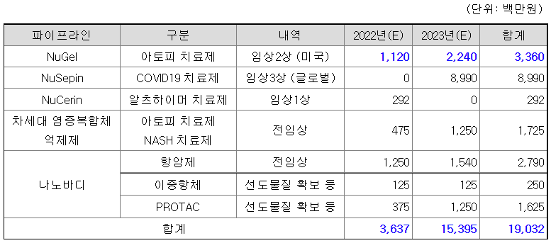 회사 자체 전망으로도 2024년전까지는 적자를 면치 못하는 것으로 되어 있는데, 과연 회사가 보유하고 있는 신약 관련 플랫폼이 얼마나 관심을 끌수 있을 지가 중요한 대목이라고 생각됩니다.