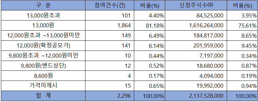희망가격 상단 이상 신청 비율은 98.87%였으며, 확정 공모가 12,000원 이상 신청 비율도 97.66%에 달했습니다.