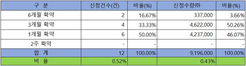 의무 보유 확약 건수는 12건에 9,196,000주로 전체 신청 물량 대비 건수로는 0.52%, 수량으로는 0.43%였으나, 신청 수량이 적어 큰 의미는 없다고 하겠습니다.