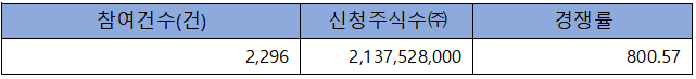 수요예측 참여 건수는 총 2,296건에 신청 주식수 2,137,528,000주로, 참여 경쟁률 800.57 : 1의 실적을 기록했습니다.