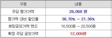 당초 희망 공모가격 하단 16,500원 대비 4,500원 ( 24.24%) 하향 조정된 가격입니다.