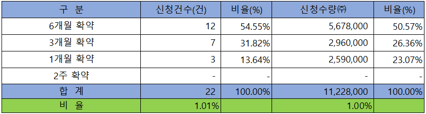 의무 보유 확약 건수는 22건에 11,228,000주로 전체 신청 물량 대비 건수로는 1.01%, 수량으로는 1.00%였으며, 6개월 확약 비중이 제일 높았습니다.