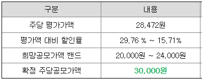 당초 희망 공모가격 상단 24,000원 대비 6,000원(25.0%) 상향 조정된 가격입니다.