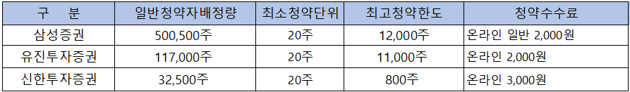 - 청약 가능 증권사 : 삼성증권, 유진투자증권, 유안타증권