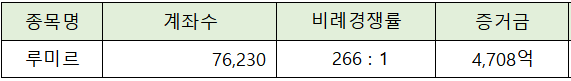 루미르의 청약에는 4,708억원의 증거금이 모이면서 266 : 1의 비교적 낮은 비례 경쟁률을 나타냈습니다.