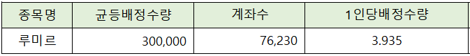 균등 배정은 총 76,230 계좌가 청약에 참가해 균등 배정 수량 300,000주를 감안하면 1인당 3.935주가 배정될 것으로 전망되고 있습니다.