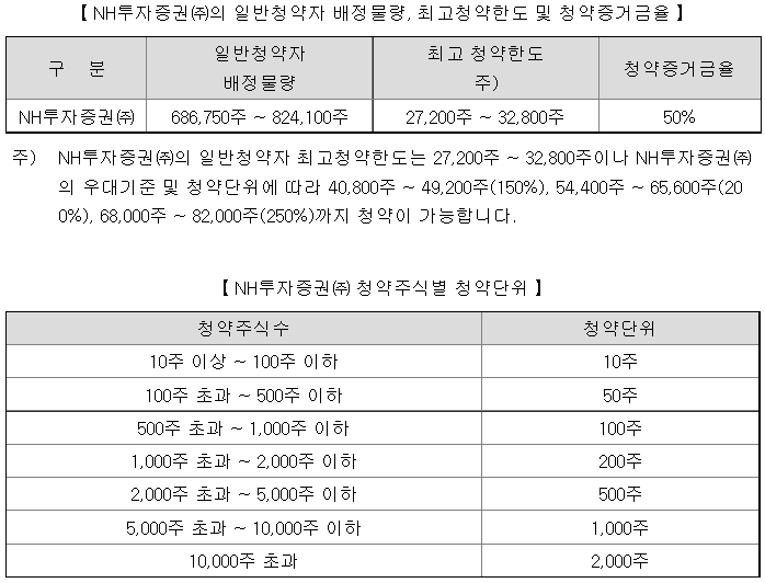 NH투자증권의 일반 청약자 배정 주식은 686,750주 ~ 824,100주이고, 일반 청약자 최고 청약 한도는 27,200주 ~ 32,800주입니다.
