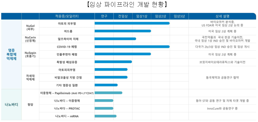 회사는 염증 복합체 억제제의 경우 염증의 활성 단계만을 억제하는 다른 염증 복합체 억제제와는 달리 염증 개시단계부터 억제하는 차별화 기술을 보유하고 있고, 이를 바탕으로 코로나 폐렴 치료제도 국제 임상 단계를 밟고 있으며, 치료제로서의 가능성이 높다고 설명하고 있습니다.