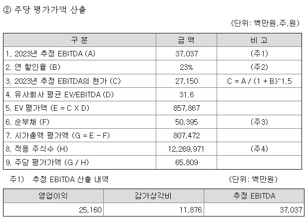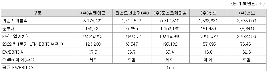 회사의 주당 평가가액은 2023년 추정 EBITDA를 2022년 현재로 할인한 후 유사 회사의 EV/EBITDA 31.6배를 적용하여 산출된 것입니다. 유사 회사로는 코스모신소재(주)와 (주) 천보가 선정되었습니다. (주)포스코케미칼과 (주)엘앤에프, (주)후성도 유사 회사로 선정되었으나 EV/EBITDA가 10배 이하 또는 50배 이상이어서 유사 회사 평균 EV/EBITDA 선정 시 아웃라이어(Outlier)로 제외되었습니다.