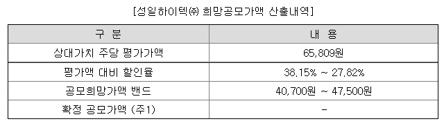 성일하이텍의 공모희망가격은 회사의 주당 평가가액 65,809원에서 27.82% ~ 38.15% 할인된 가격입니다.