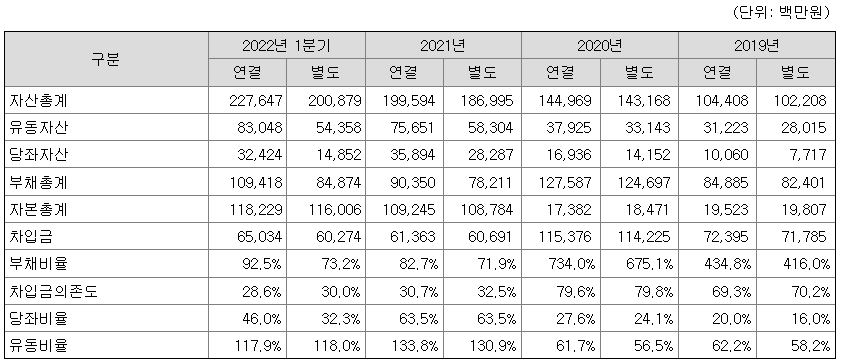 동사의 연결 기준 부채 비율은 2019년 434.8%, 2020년 734.0%였으나 2021년 82.7%로 양호한 부채 비율을 보이고 있습니다. 2019년과 2020년 하이드로센터 및 군산 제2공장 증설 등에 따는 대규모 시설 자금 차입으로 부채비율이 급등했으나 2021년의 영업이익을 통해 차입금을 일부 상환하였고 상환우선주 전량을 보통주로 전환하였습니다.