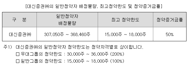 일반 청약자 최고 청약한도는 KB증권의 경우 10,000주 ~ 12,000주, 대신증권의 경우 15,000주 ~ 18,000주, 삼성증권의 경우 2,500주 ~ 3,000주입니다. 청약수수료는 KB증권 온라인 일반 기준 1,500원, 대신증권 온라인 기준 2,000원, 삼성증권 온라인 일반 기준 2,000원입니다.