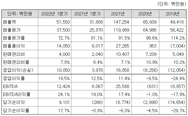 동사의 수익성은 2019년 114.2%의 매출원가율을 보였으나 2020년 98.6%, 2021년 81.5% 2022년 1분기 72.7%로 개선되는 추이를 보이면서 영업이익율도 개선되고 있습니다.
