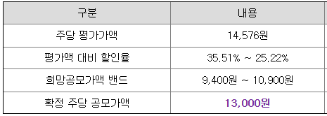 당초 희망 공모가격 상단 10,900원 대비 2,100원(19.27%) 상향 조정된 가격입니다.