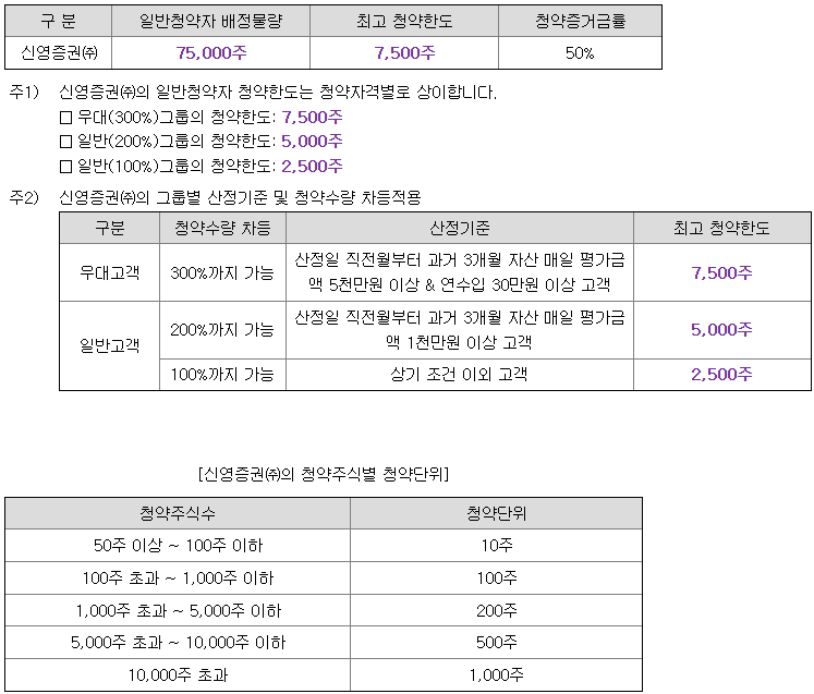 신영증권의 일반 청약자 배정 물량은 75,000주이고, 일반 청약자의 최고 청약 한도는 일반그룹 기준 2,500주입니다.