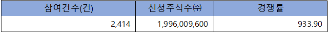 수요예측 참여 건수는 총 2,414건에 신청 주식수 1,996,009,600주로, 참여 경쟁률 933.90 : 1의 실적을 기록했습니다.