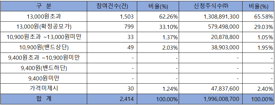 희망 공모가격 상단 이상 신청 비율은 97.60%였으며, 확정 공모가 13,000원 이상 신청 비율도 94.61%에 달했습니다.