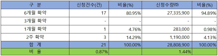 의무 보유 확약 건수는 21건에 28,808,900주로 전체 신청 물량 대비 건수로는 0.87%, 수량으로는 1.44%였으며, 6개월 확약 비중이 제일 높았습니다.