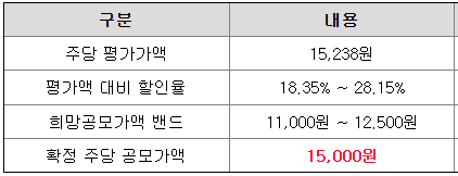 당초 희망 공모가격 상단 12,500원 대비 2,500원(20.0%) 상향 조정된 가격입니다.