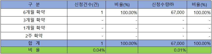 의무 보유 확약 건수는 1건에 67,000주로 전체 신청 물량 대비 건수로는 0.04%, 수량으로는 0.01%였으나, 1건밖에 신청이 없어 경쟁률이나 제시 가격에 비해 매우 낮은 현상을 나타냈습니다.