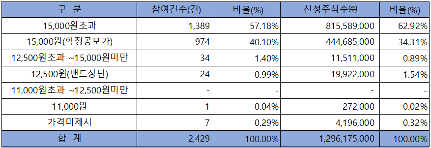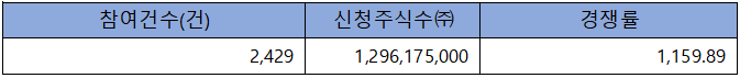 수요예측 참여 건수는 총 2,429건에 신청 주식수 1,296,175,000주로, 참여 경쟁률 1,159.89 : 1의 실적을 기록했습니다.
