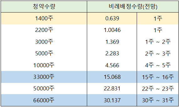 일반 청약자의 최고 청약 한도인 33,000주 신청시에는 15주 ~ 16주 배정이 전망되고, 우대 등급의 최고 청약 한도인 66,000주까지 풀 청약 신청한 경우에는 30주 ~ 31주 배정이 예상됩니다.