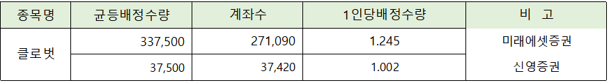 균등배정은 미래에세증권이 인당 1.245주, 신영증권 1.002주로 청약에 참여한 모든 청약자에게 1주는 기본으로 배정되고, 확률은 낮지만 2주 배정도 기대해볼 수 있는 결과입니다.