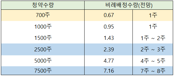 일반 청약자의 최고 청약 한도인 2,500주 신청시에는 2주 ~ 3주 배정이 전망되고, 우대 등급의 최고 청약 한도인 7,500주까지 풀 청약 신청한 경우에는 7주 ~ 8주 배정이 예상됩니다.