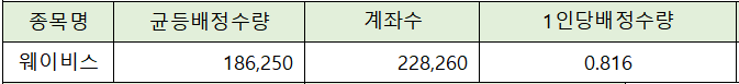 균등배정은 총 228,260 계좌가 청약에 참가해 균등 배정 수량 186,250주를 감안하면 1인당 0.816주가 배정될 것으로 전망되고 있습니다. 청약에 참여한 일반 투자자중에서 81.6%가 1주를 배정받을 수 있을 전망입니다.