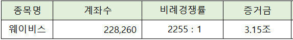 웨이비스의 청약에는 3.15조원의 증거금이 모이면서 2,255 : 1의 비례 경쟁률을 나타냈습니다.