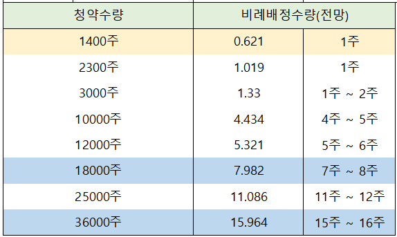 일반 청약자의 최고 청약 한도인 18,000주까지 청약 신청한 경우 7주 ~ 8주 배정이 예상되며, 우대 등급의 최고 청약 한도인 36,000주까지 풀 청약한 경우에는 15주 ~ 16주 배정이 전망되고 있습니다.