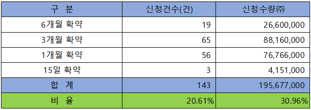 의무 보유 확약 건수는 143건에 195,677,000주로 전체 신청 물량 대비 건수로는 20.61%, 수량으로는 30.96%였으며, 3개월 이상 확약 비율이 전체 청약 수량의 18.16%, 의무 보유 확약 주식 수의 58.65%에 달했습니다.